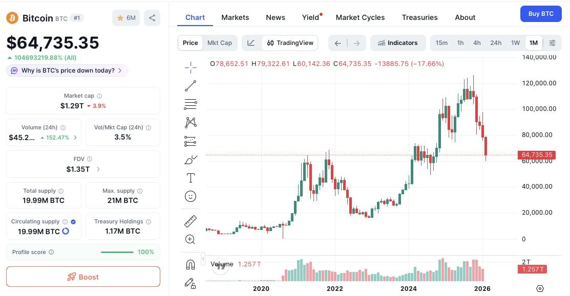 Bitcoin peaked at $126,000 in October 2025 and fell below $65,000 four months later, marking a nearly 48% decline from its all-time high. For many investors who entered during the rally, the past few months have been marked by heavy losses and uncertainty. The question now dominating market sentiment is simple, “where does Bitcoin go from here?“ To answer that, it is important to analyze the cause of decline, compare it to the previous market cycles, and assess the most likely scenarios for the next phase of Bitcoin
