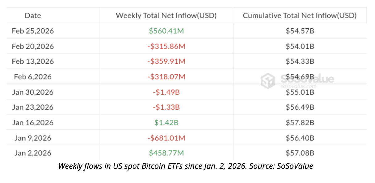 Early Signs of Institutional Repositioning Some institutional selling is cycling into repositioning rather than permanent exit. On February 25, U.S. spot Bitcoin ETFs recorded $560.41 million in net inflows, the largest single-day total since early February ending a five-week streak of outflows. Fidelity’s FBTC led with roughly $83 million, followed by BlackRock’s IBIT with around $79 million. Though one day does not confirm a market reversal, it shows that demand at these price levels has not reduced suggesting that institutional interest remains stable even amid recent volatility.