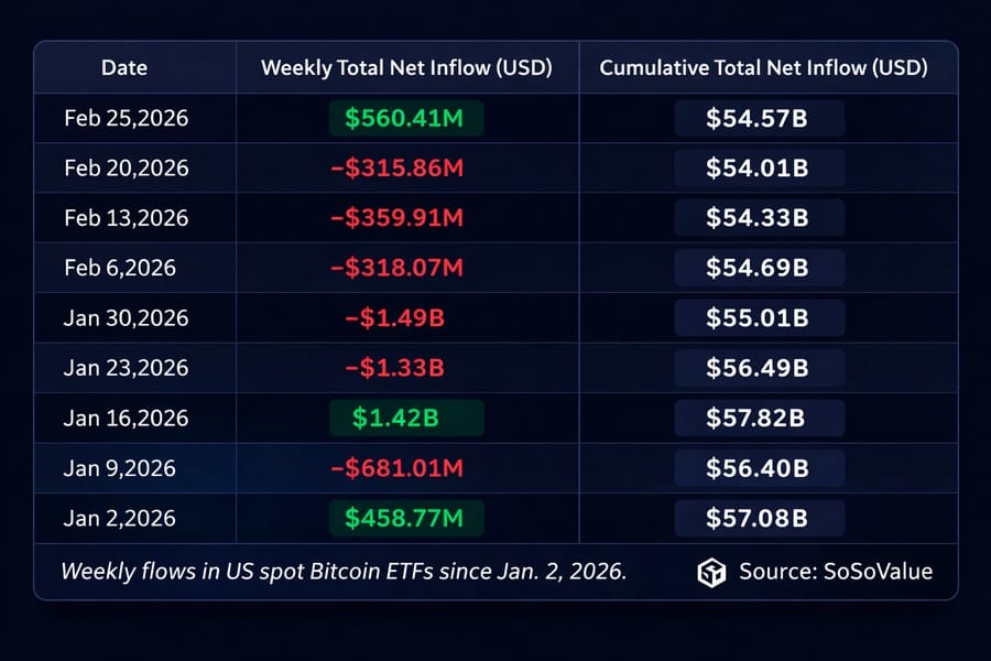 Some institutional selling is cycling into repositioning rather than permanent exit. On February 25, U.S. spot Bitcoin ETFs recorded $560.41 million in net inflows, the largest single-day total since early February ending a five-week streak of outflows. Fidelity’s FBTC led with roughly $83 million, followed by BlackRock’s IBIT with around $79 million. Though one day does not confirm a market reversal, it shows that demand at these price levels has not reduced suggesting that institutional interest remains stable even amid recent volatility.