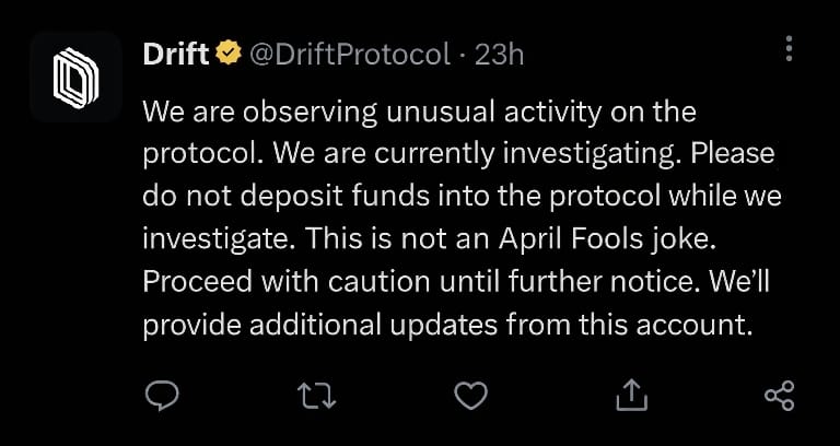 When blockchain security firm PeckShield flagged unusual outflows from Drift Protocol on April 1, many users assumed it was a prank. The Drift team was forced to address the confusion head-on, posting on X that this was "not an April Fool's joke" and urging users to stop interacting with the protocol immediately. It wasn't a joke. It was the largest DeFi exploit of 2026.