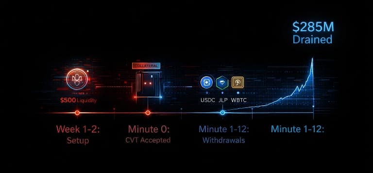 With a compromised admin key, the attacker listed CVT as valid collateral on Drift, removed all withdrawal limits, and executed 31 rapid withdrawals draining USDC, JLP, WBTC, and other real assets in approximately 12 minutes.