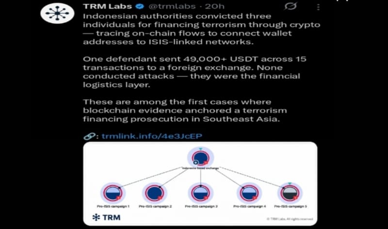 They didn't need informants or wiretaps and according to TRM Labs in a report published last Sunday, “Indonesian courts have demonstrated that cryptocurrency evidence, wallet addresses, transaction histories, and on-chain flows is not only admissible but can anchor a terrorism financing prosecution.”